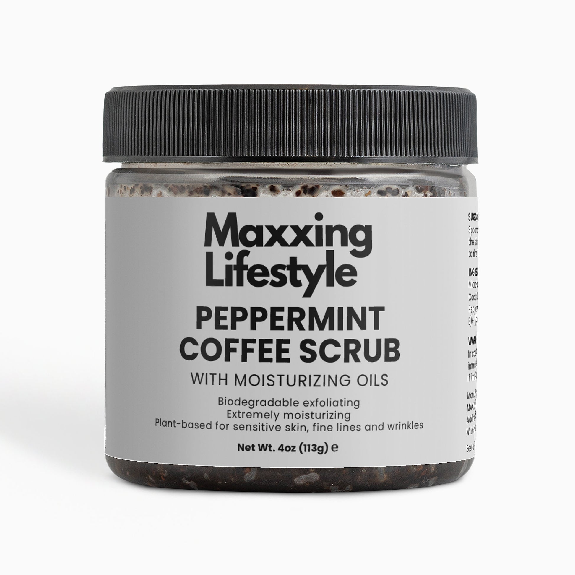 Ingredients: Micro-Roasted Coffee*+, Brown Sugar*+, Coconut Oil*+, Castor Oil*+, Sea Salt, Peppermint Essential Oil*, Tocopherol (Vitamin E)+ // *Organic +Food-Grade